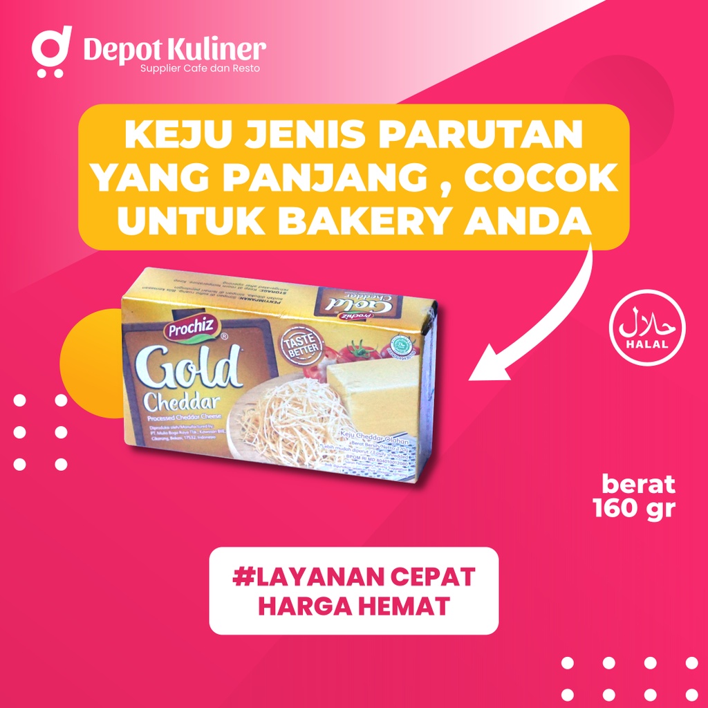 Keju Prochiz Gold Cheddar cocok digunakan untuk keperluan bakery anda. Keju ini memiliki rasaa yang lebih gurih, lebih tahan terhadap suhu tinggi dan jenis parutan yang panjang.