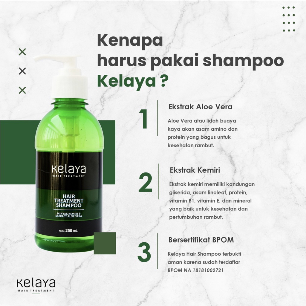 2. Apakah boleh menggunakan Kelaya Hair Treatment Shampoo setiap hari? Untuk hasil lebih maksimal, kami rekomendasikan untuk menggunakan setiap hari 2x sehari. Namun bila kerontokan sudah pulih kembali, cukup 2-3 kali dalam seminggu.