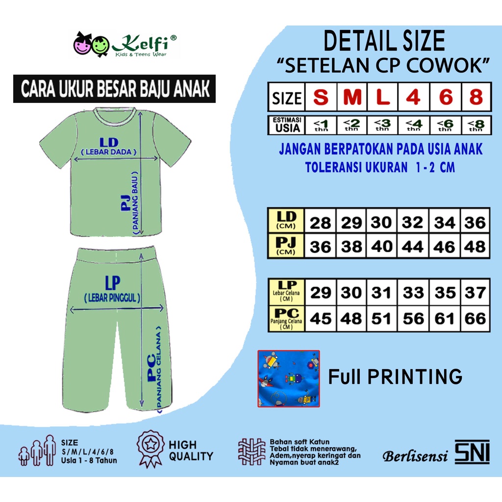 Kelfi kini hadir setelan motif Full Printing baru buat Buah hati Anda dengan gambar cute dan Nyaman di pakai anak sehari - hari. Produk sudah bersertifikat SNI