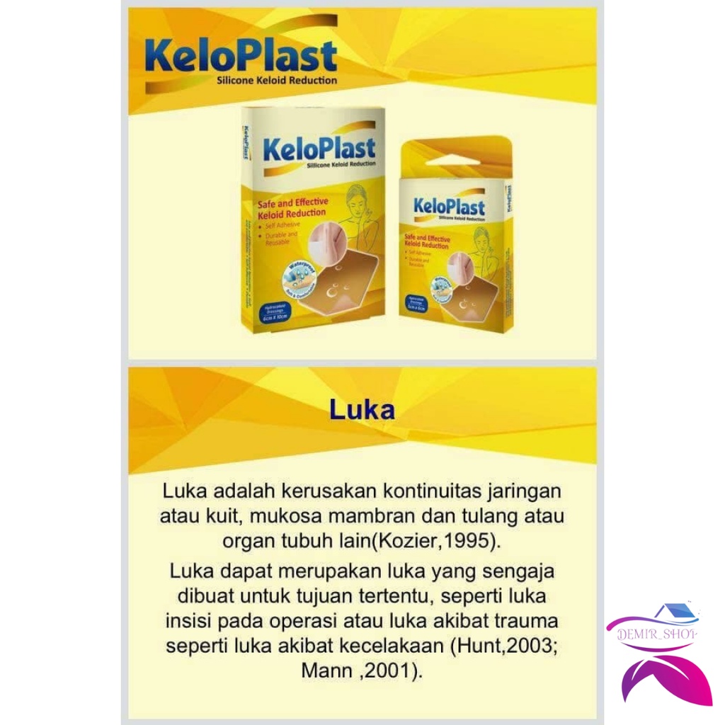 Deskripsi : Keloplast adalah plester yang dirancang khusus untuk menghilangkan bekas luka yang telah menggelap atau kemerahan, serta mencegah timbulnya keloid atau bekas luka yang menonjol. Keloid terjadi akibat produksi protein berlebih di dalam tubuh, terutama selama proses penyembuhan.