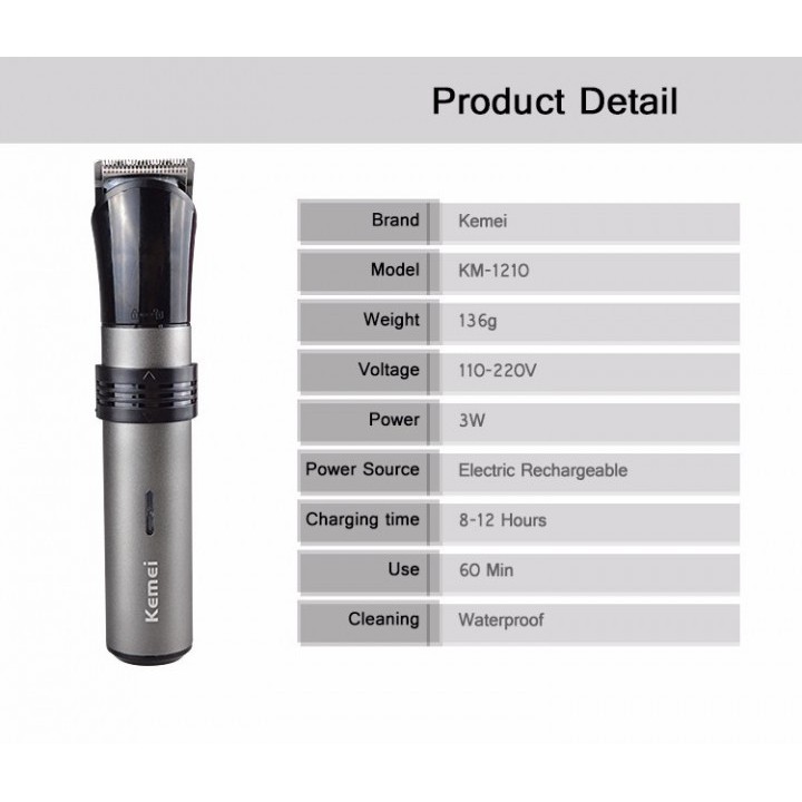 Brand : Kemei model : KM-1210 origin : China material : plastic voltage : 110-220 V frequency : 50-60 Hz power : 3W power scource : electric rechargeable batteries charging time : 8-12 hours use of time : 60 minutes cleaning : waterproof