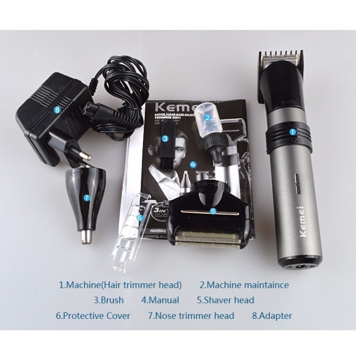 the package includes: 1. Machine (Hair head trimmer) 2. Machine maintaince 3. Brush 4. Manual 5. Shaver head 6. Protective cover 7. Nose trimmer head 8. Adapter