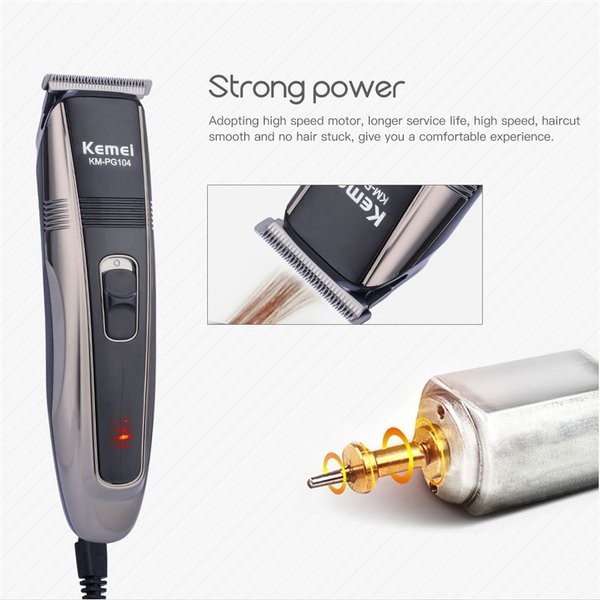 Pisau baja tahan karat yang tajam dapat memotong rambut dengan mudah dan lancar, dan pisau dapat dilepas, mudah dibersihkan. Itu datang dengan 4 sisir batas yang berbeda (3mm / 6mm / 9mm / 12mm), lebih mudah untuk mengontrol panjang pemotongan dan mendapatkan efek pemotongan yang lebih baik. Desain bodi anti-selip ergonomis, terasa nyaman untuk digenggam. Penggunaan ganda kabel dan tanpa kabel. Baterai Li-ion built-in, setelah 2 jam pengisian penuh, dapat digunakan terus menerus selama 90 menit. Kemei PG 104 clipper carghing