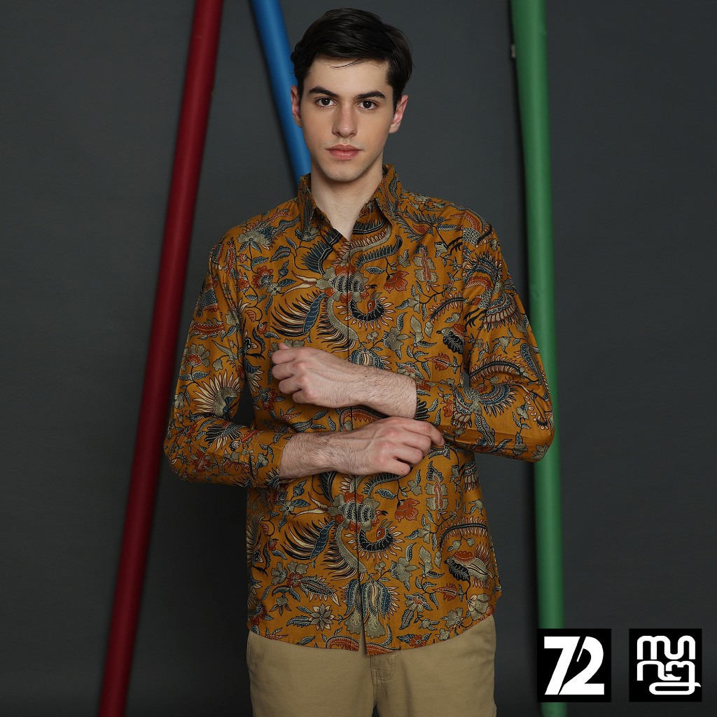 Pakaian Pria > Batik > Atasan Batik > KEMEJA BATIK PRIA Katun Lengan Panjang Slimfit Motif Burung Duri Warna Kuning 723351 Cap 72 - Baju Kemeja Atasan Pakaian Setelan Batik Pria Cowok Laki Laki Remaja Keluarga Kantor Lengan Panjang Modern Slimfit Slim Fit Premium Kekinian