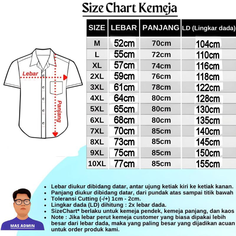 --------------------------------- √ Bahan Batik Bagus, Katun Prima √ Tekstur Halus Dan Lembut √ Tingkat Ketebalan Sedang √ Serat Kain, Rapat / Tidak Menerawang √ Kelebihan Lain, Ringan, Adem dan Nyaman Di pakai √ Cuting Mantab Tidak Gombrong ----------------------------------- UKURAN TERSEDIA ------------------------------ LD (lingkar dada ) M - 104cm. L - 108.cm. XL - 112cm. XXL - 118cm. 3XL - 122cm. 4XL - 126cm. 5XL - 130cm. 6XL - 135cm. 7XL- 140cm. 8XL-145cm. 9XL-150cm. 10XL-155cm