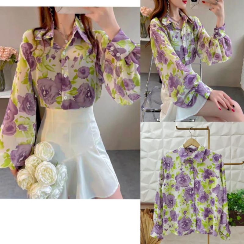 KEMEJA BUNGA UNGU // ATASAN IMPORT PREMIUM // KEMEJA IMPORT BKK // TOP IMPORT PREMIUM BKK // FASHION IMPORT KOREA