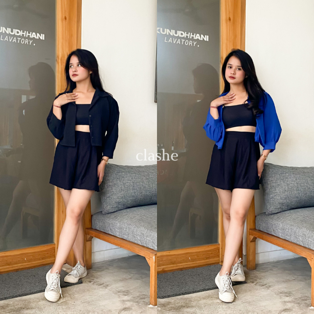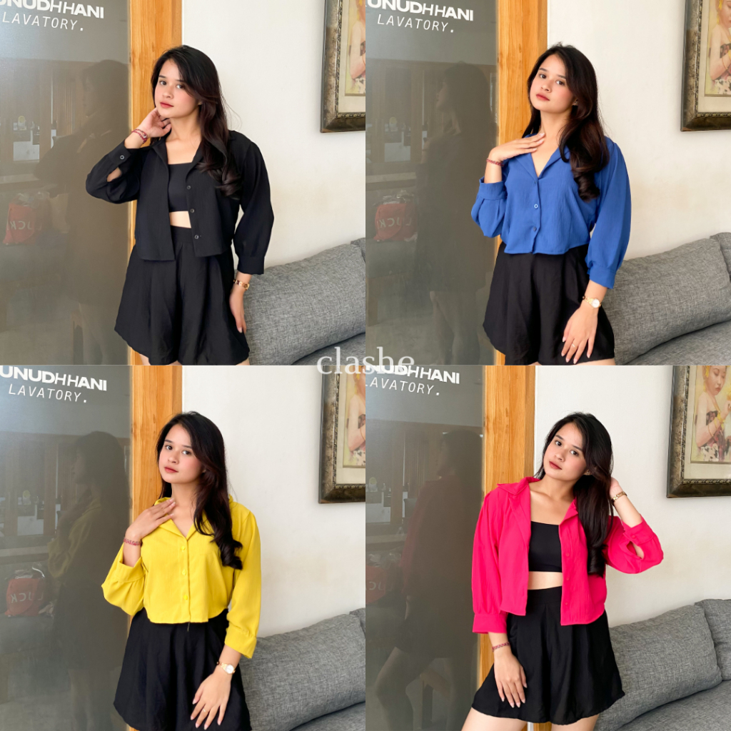 Kemeja Crop Wanita Lengan Panjang Crinkle Airflow Anti Lecek Terbaru Kekinian Korean Style Ootd Raisa Shirt by Clashe