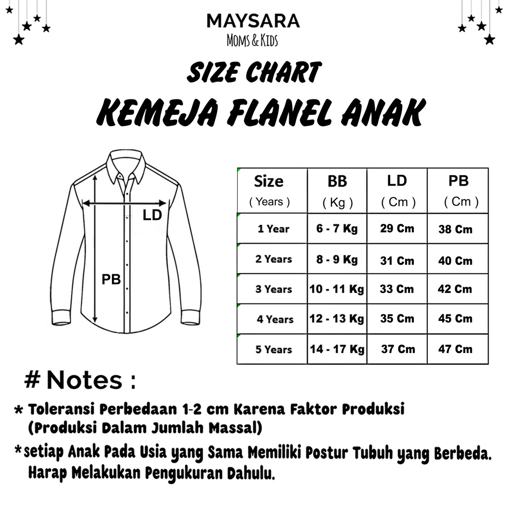 Setiap anak memiliki postur tubuh yg berbeda. Harap melakukan pengukuran dahulu. Jangan jadikan size chart sebagai acuan.