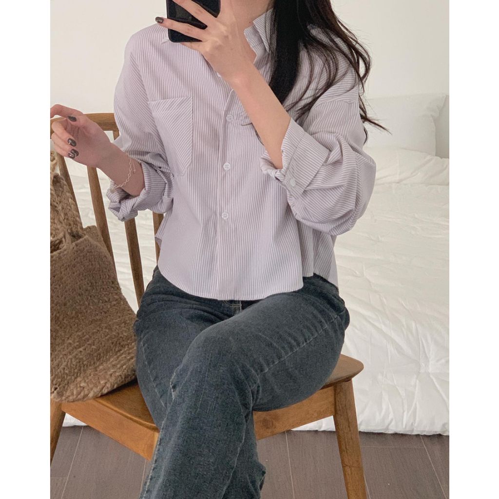 Detail Kemeja Garis Garis Wanita Atasan Wanita Kekinian kasual Cardigan Korean Style