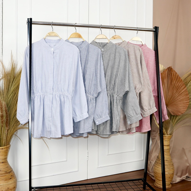 Detail KARA.ID HARUKA Kemeja Kerah Shanghai - Atasan Wanita Salur Lengan Panjang - Stripe Shirt