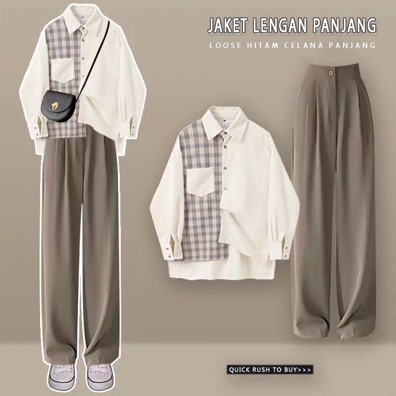 Kemeja Kotak-kotak Wanita korean style Jaket Lengan Panjang Retro atasanatasan wanita kaos wanita/One Set Wanita/Celana Kulot Highwaist Loose Pant