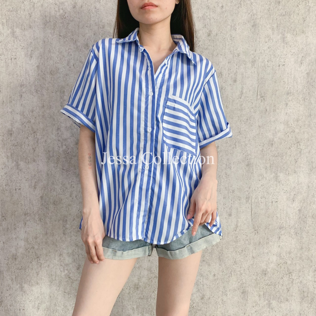 Kemeja Oversized Salur Inako IDR 73,000 Available in Ochre, Icy Pink, Blue Bell and Mint Material : Saluria LD : 116cm Length : 66cm (front) 70cm (back) *warna & motif sesuai foto gantung *kancing hidup *grosir minimal 4pcs (bisa campur warna) disc 5,000/pcs, tidak dapat digabung dengan discount lain