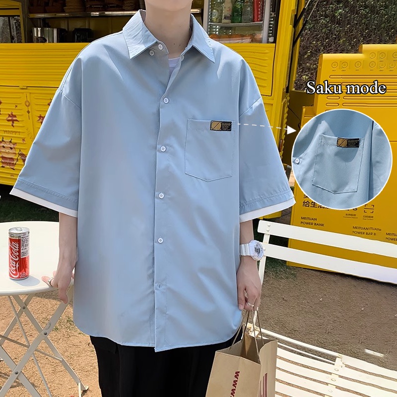 Pakaian Pria > Atasan > Kemeja > Kemeja Pria Korean Style Lengan Pendek Longgar Shirt Polos Pria atasan kemeja oversize Baju Laki Laki hitam Kemeja Cowok Atasan pria Oversize terbaru Dua Potong kemeja Blue