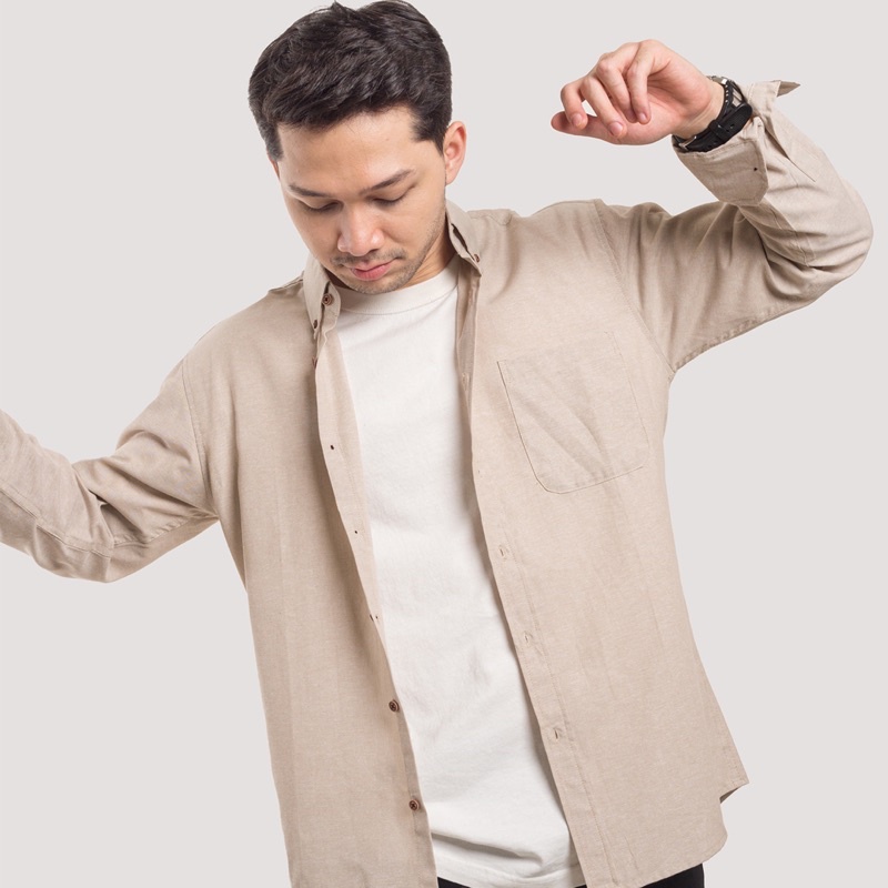 Detail Kemeja Pria Polos WOODCUTTER Basic Shirt - Cream Khaky Longsleeve Lengan Panjang