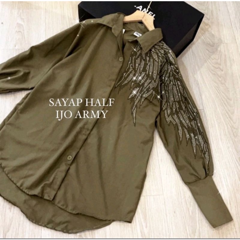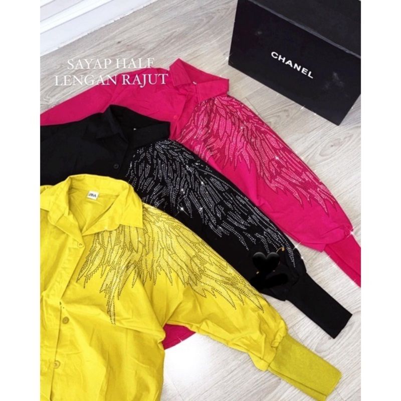 Detail kemeja sayap swarosky depan belakang tangan rajut