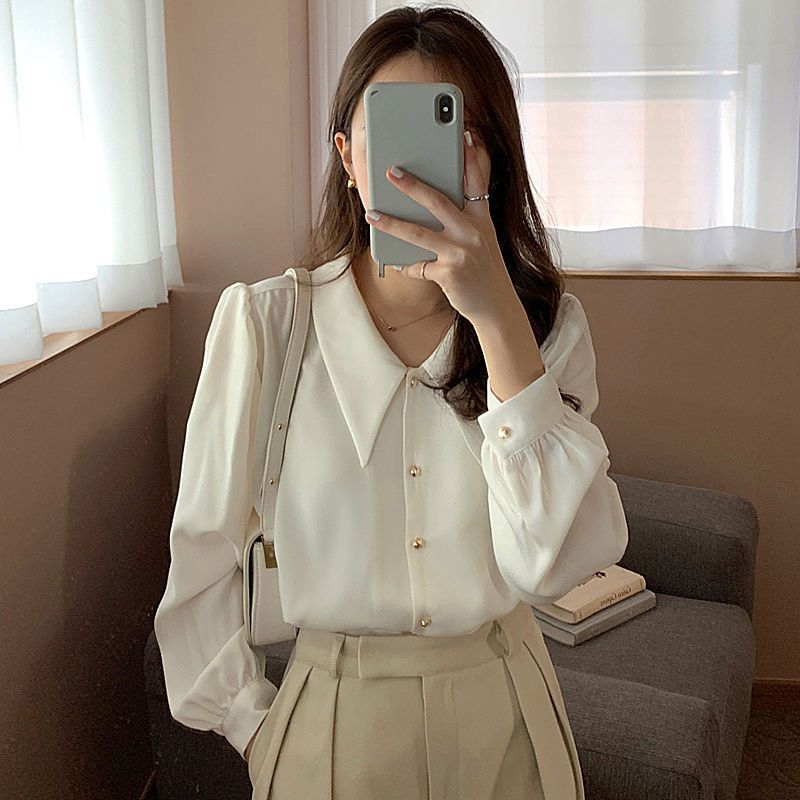 Bahan : Viscose Rayon Kelebihan Produk : (Silahkan LIhat Video Produk) 1. Bahan Adem dan Nyaman. 2. Elegan - Button warna gold seperti di gambar (Silahkan lihat gambar terakhir yang kita foto tanpa editan ya) 3. Warna Putih Bersih dan Hitam Pekat. 4. Desain Kerah Besar Ala Korea. Bisa juga dijadikan inner top seperti model digambar untuk tampilan ala Korea. 5. Tersedia Size S-L