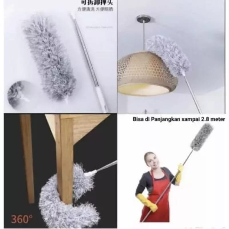 Fitur: - 2 in 1 penggunaan, bisa pakai stick atau gagang tangan. - Penggunaan dengan stick dapat dipanjangkan sampai 2,8 Meter, dapat membersihkan langit -langit/ AC/ atas lemari, semua permukaan dengan ketinggian susah dibersihkan. - Bahan microfiber dapat mengangkat debu dengan sempurna, seperti magnet. - Kemoceng dapat dicuci dan dipakai semula kala.