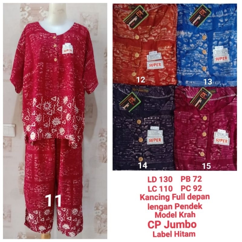 Model Krah kancing depan Spesifikasi: Kancing Full depan Lingkar Dada 130cm Panjang Baju 72cm Lingkar celana 110cm (karet ditarik) Panjang Celana 92cm Lingkar Paha 75cm Lengan pendek Tidak ada kantong