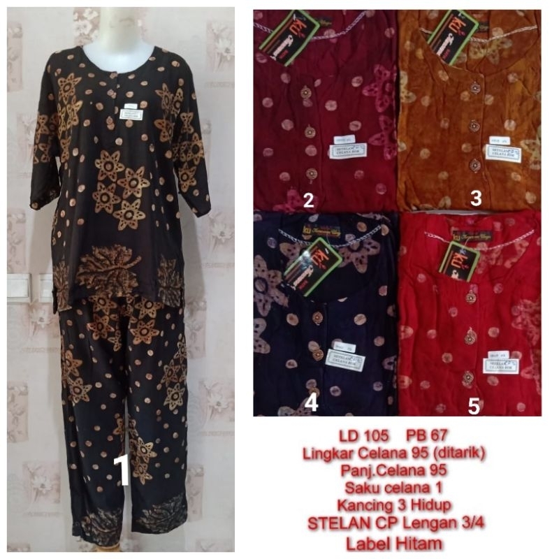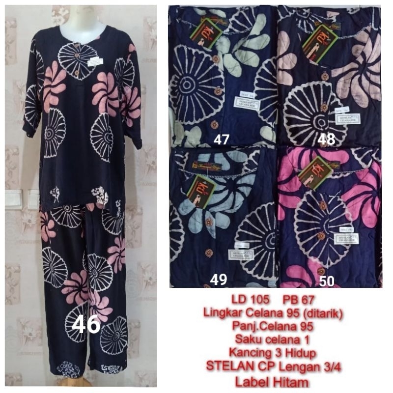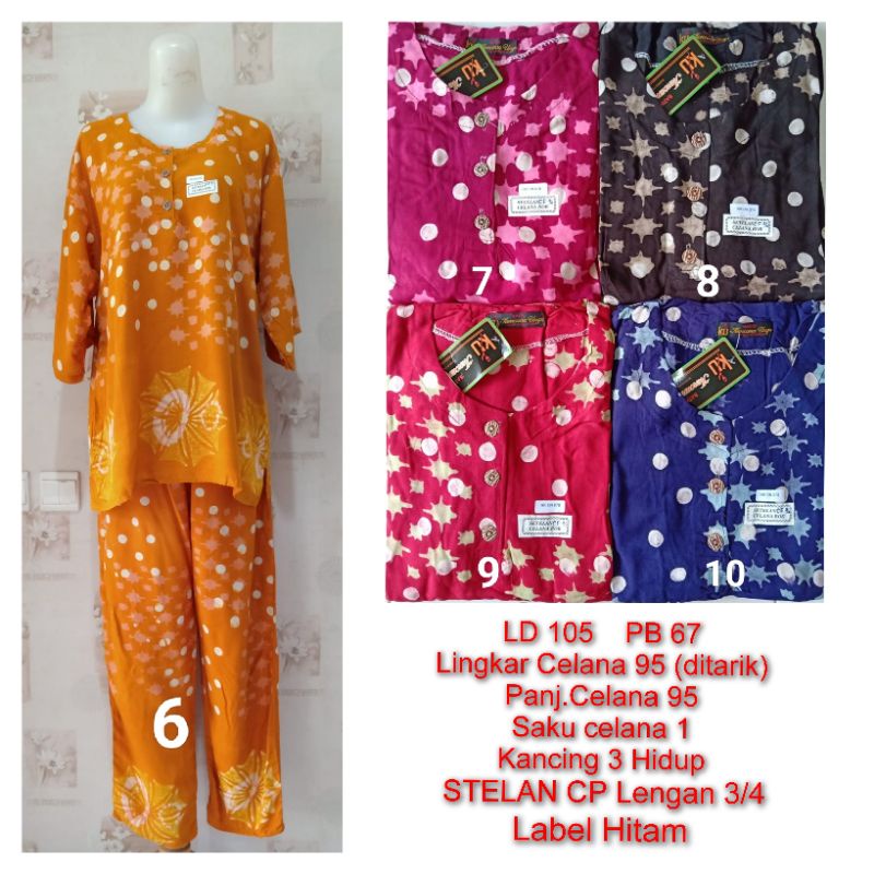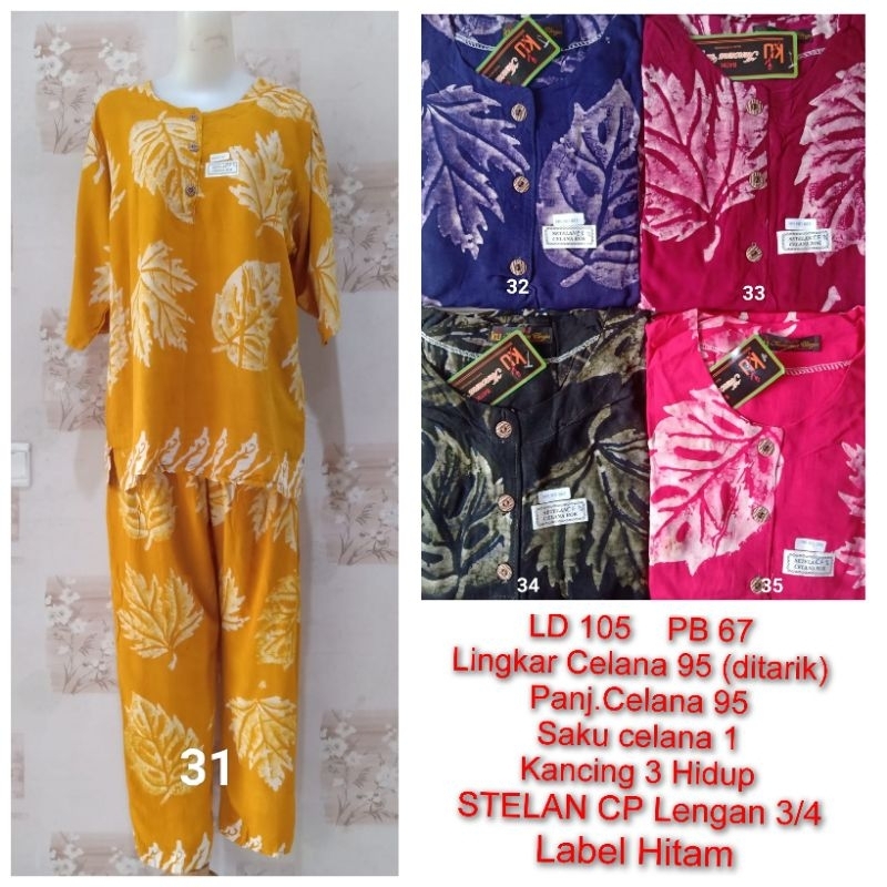 Stelan Kencana Ungu CP Lengan 3/4 Label Hitam Ori Bahan rayon shantung, sejuk nyaman dipakai LD 105 cm (Lingkar dada) PB 67cm (panjang baju) PC 95 cm (panjang celana) LC 95 cm (lingkar celana) Celana pakai karet, ukuran LC saat ditarik Kancing 3 Hidup Saku di Celana 1 Lingkar paha 60 cm