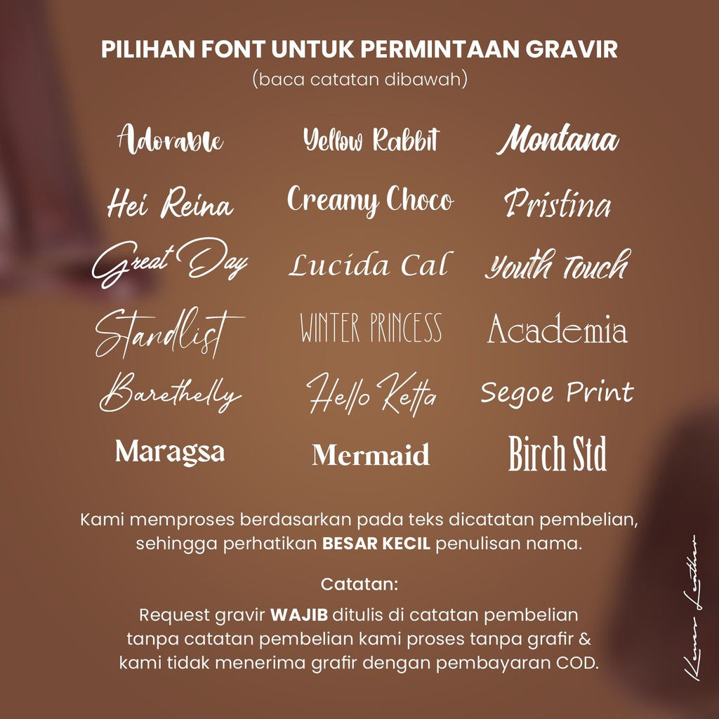 PERHATIAN !!! - Semua produk kami BERGARANSI KULIT ASLI 100%, jika terbukti bukan kulit asli maka akan kami balikin uang kamu 1000%. - Order sebelum jam 12.00 barang dikirim dihari yang sama (kecuali grafir dan hari libur). - FREE GRAFIR / UKIR NAMA proses 1 hari kerja (WAJIB mengisi keterangan nama, jenis font, dan posisi grafir). BUKAN DI CHAT ! Jika tidak ada keterangan di catatan pemesanan maka akan kami kirim tanpa grafir. - Permintaan grafir TIDAK BISA MENGGUNAKAN PEMBAYARAN COD. Jika order minta digrafir tetapi COD akan kami kirim tanpa grafir. Mohon maaf ketidaknyamanannya. - Barang yang sudah digrafir TIDAK BISA DITUKAR / DICANCEL dengan alasan apapun. - FREE PACKING KARDUS setiap transaksi. Jika menginginkan kardus tambahan perbarang mohon tulis di keterangan. - Menerima orderan custom pengadaan kantor / instansi dengan minimal order dan DISKON KHUSUS. - BIJAKLAH DALAM MEMBERIKAN BINTANG / ULASAN. Semua permasalahan dapat didiskusikan secara kekeluargaan / win win solution. - Mohon maaf yang memberi bintang 1/2/3 TIDAK AKAN KAMI COVER GARANSI. - KHUSUS PENGIRIMAN LUAR JAWA HARAP MENGGUNAKAN EKSPEDISI JNE ATAU JNT