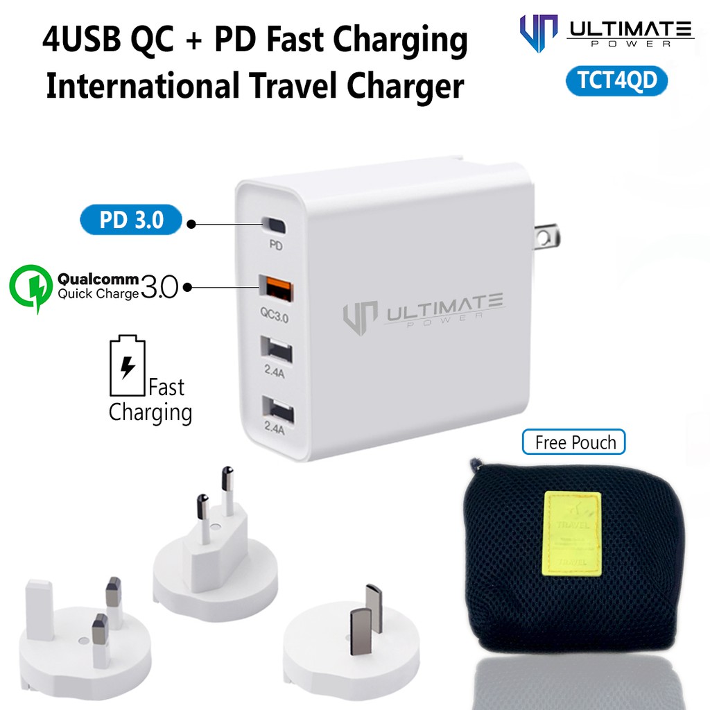 Ultimate Power 4USB QC+PD Fast Charging International Travel Charger ini telah mendukung fitur Fast Charging QC 3.0 untuk Android dan Fast Charging PD 3.0 untuk iPhone / iPad / Macbook.