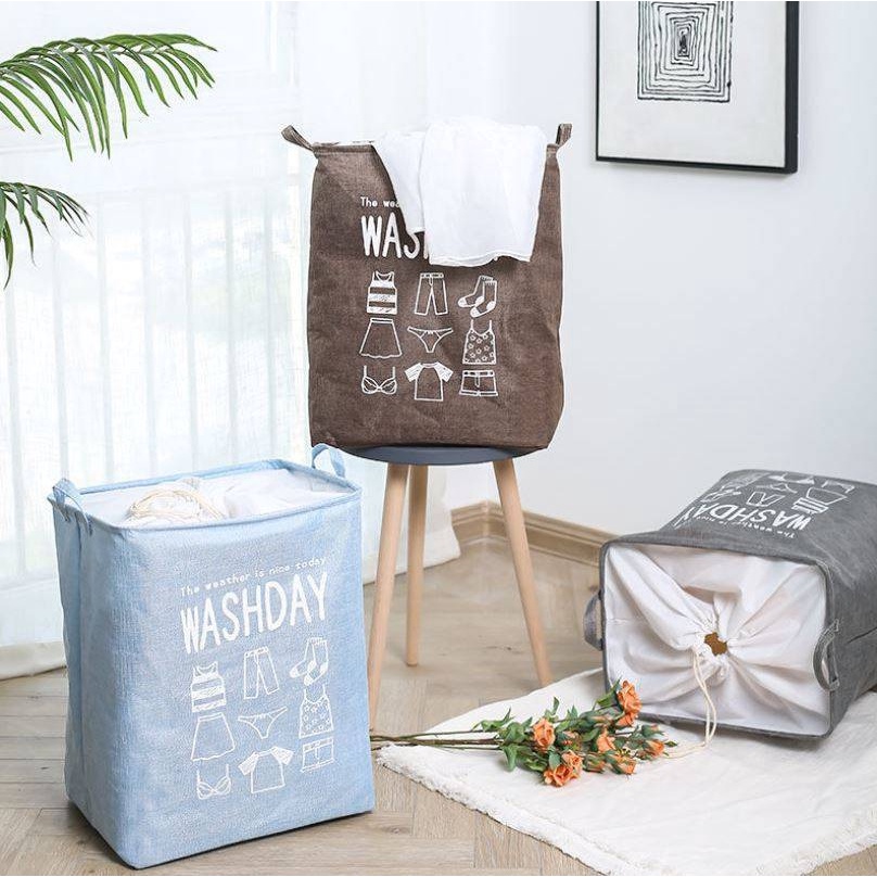Material : Kain katun + linen Kapasitas : 75 Liter Ukuran : 44 X 33 x 54 cm Laundry Bag WASHDAY Penutup Serut