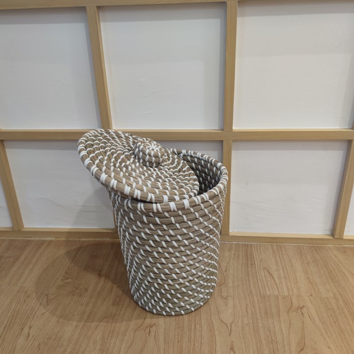 Detail Keranjang Basket Mini Mendong Tutup Corak Enceng Gondok 24x24x28cm