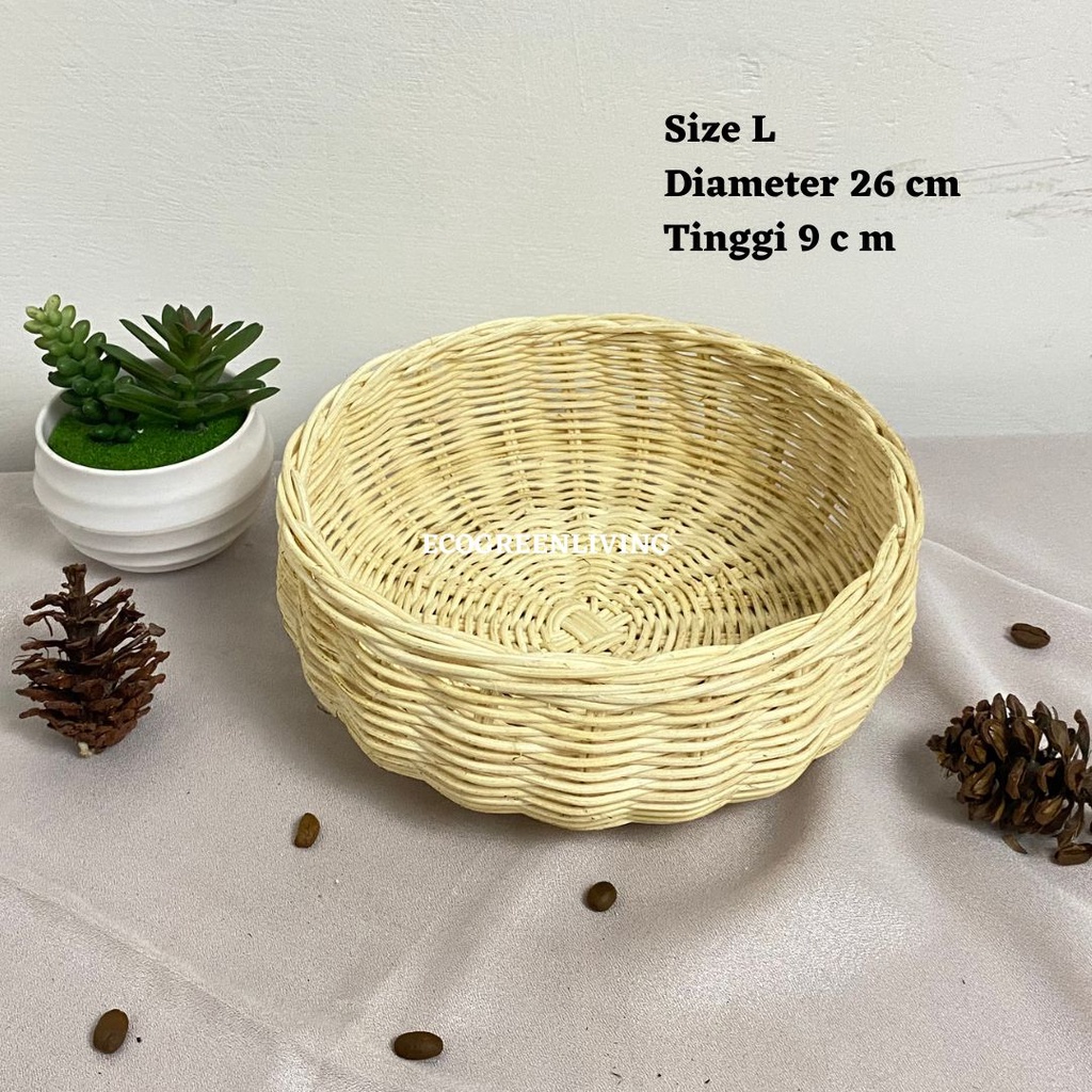 SPESIFIKASI PRODUK * Ukuran: S : D 20cm x T 7cm M : D23cm x T 7 cm L : D26 cm x T 9cm * Bahan: Anyaman rotan alami * Finishing: Melamine Clear