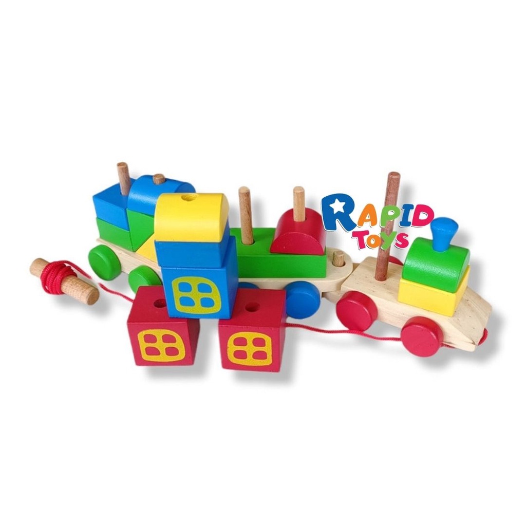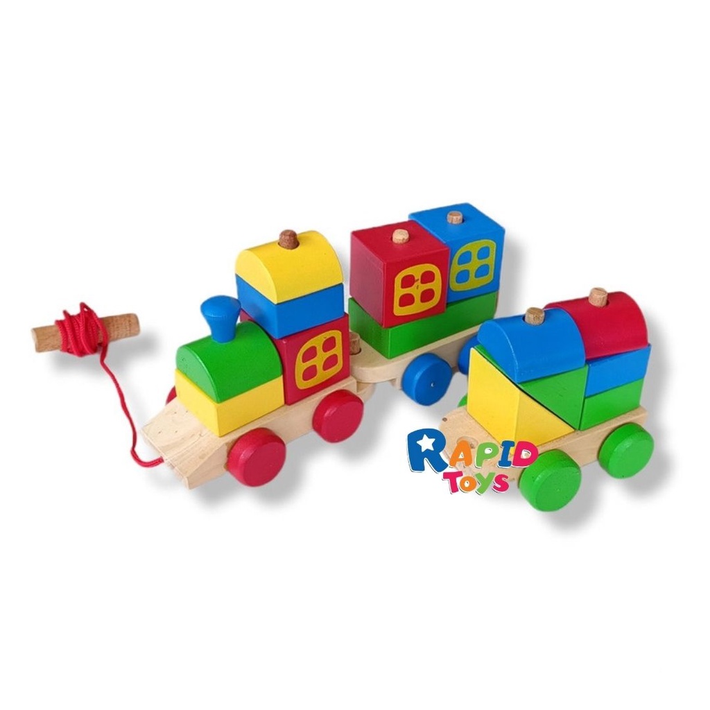 Fitur : -Terbuat dari kayu berkualitas -Berbentuk kereta dengan warna seperti pelangi -Terdapat 4 bentuk ( Lingkaran, Segituga, Persegi Panjang, Persegi ) -Masingmasing bentuk terdiri dari 4 pcs -Setiap Bentuk pada bagian badan kereta bisa dilepas pasang -Terdiri dari 12 roda ( bisa berputar ) -Badan kereta bisa dilepas pasang dan mudah untuk dikaitkan kembali. -Didepan kepala kereta terdapat tali yg tersambung dengan stik, memudahkan anak menarik kereta.