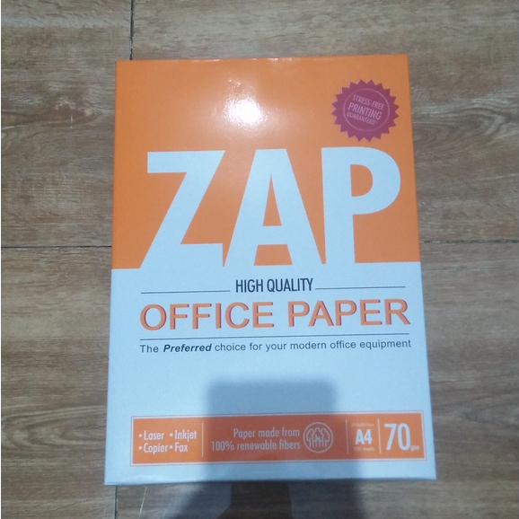 Spesifikasi : Kertas : HVS A4 ZAP Gramatur : 70gsm Ukuran : 21 x 29.7cm Min Pembelian : 1 Whiteness : Extra-white Technology : PCC Pigment - Improve smoothness, thickness, & opacity, while reducing wood-fiber usage. Certifications : Lembaga Ekolabel, ISO