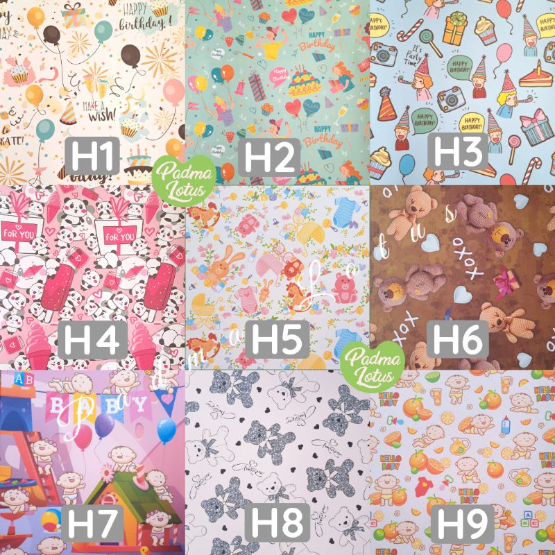 harga untuk 10 lembar, ukuran perlembar 63,5x49,5cm tebal 80gsm merk Sansan Wawa, tidak mengkilap (doff) Warna satu sisi, belakang putih kode variasi lainnya tersdedia di link lain, silakan chat admin tersedia berbagai tema kertas kado , seperti tema bunga, anak2, super hero, bunga, ultah, princess, disney, polkadot, kotak2, garis salur, dino, keroppi, animal,