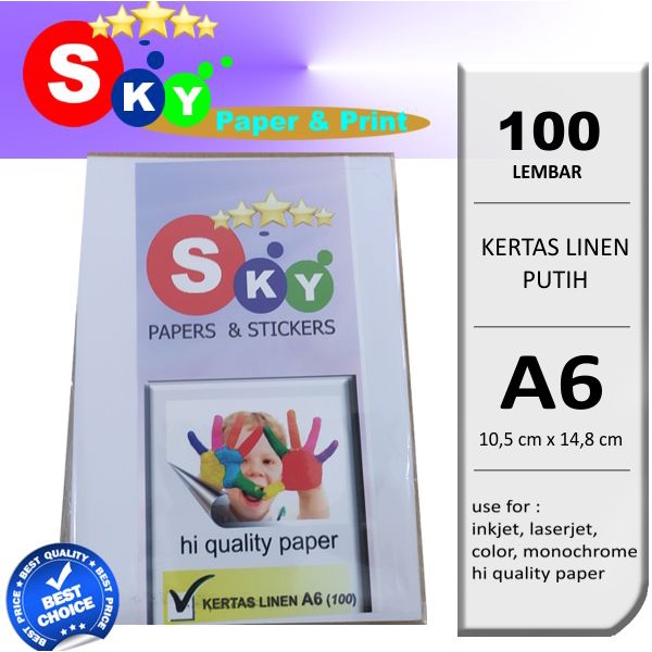 ukuran ketebalan 230 gsm ukuran A6 isi 100 lembar Warna Putih bisa dicetak dengan segala jenis printer inkjet dan laserjet