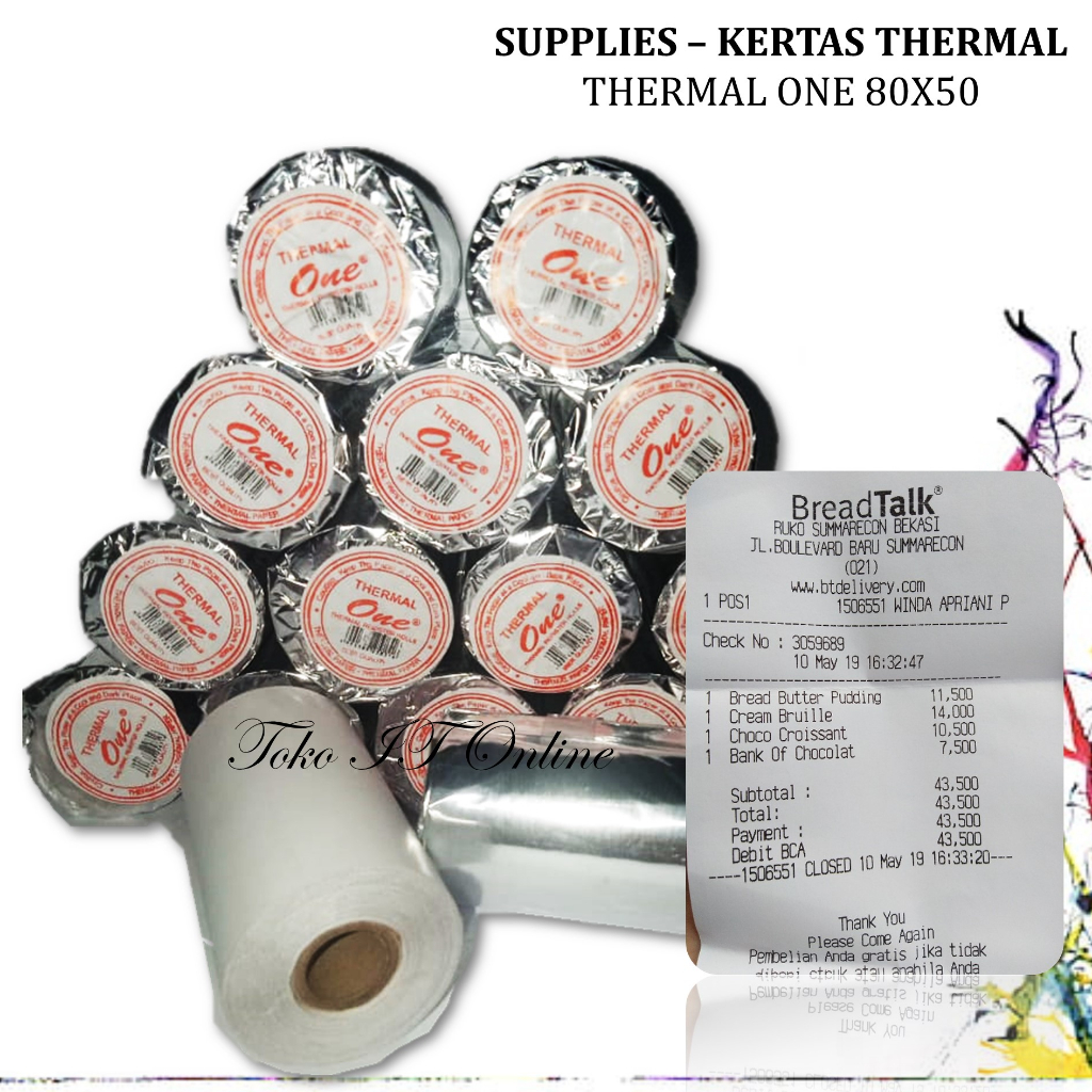 Kertas struk Thermal One biasa digunakan dalam printer kasir dengan ukuran - Lebar : 80 mm - Diameter : 50mm - Panjang : 25 meter - 1 DUS isi : 100 Roll - Harga yang tercantum diatas untuk 1 Roll - Berat yang tercantum diatas untuk 1 Roll - Warna Hitam