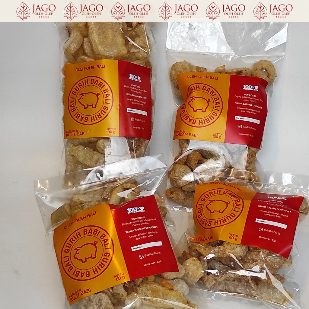 INFO PRODUK # Kerupuk Babi Bali Gurih Kulit dan Samcam # Berat barang: 60gr # Tahan lama: +/- 14 hari sebelum dibuka dan +/- 1 bulan di simpan di kulkas, atau lihat tanggal exp. yang tertera pada kemasan