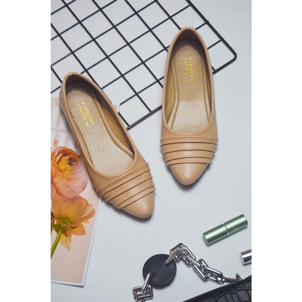 Flatshoes garis-garis premium KESS shoes cocok untuk acara formal maupun casual, dengan model cantik dan bagian pijakan yg menggunakan busa sehingga sangat empuk, menambah kenyamanan heels ini. - Kondisi : 100% Baru, Empuk, Berkualitas Tinggi - Bahan : Kulit Sintetis - Warna : Black, Ivory, Sage Green, Mauve, Navy Ukuran 37: 23cm 38: 23.5cm 39: 24cm 40: 24.5cm