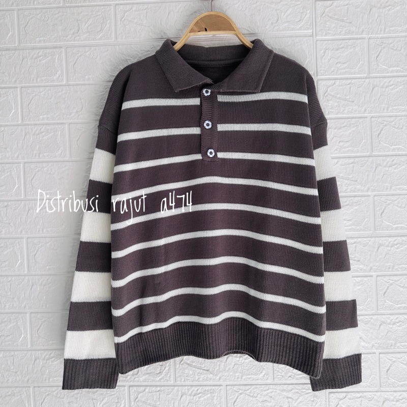 Detail KEY KEY POLO SWEATER RAJUT KANCING MOTIP BLASTER STRIPE OVERSIZE ATASAN LENGAN PANJANG WANITA