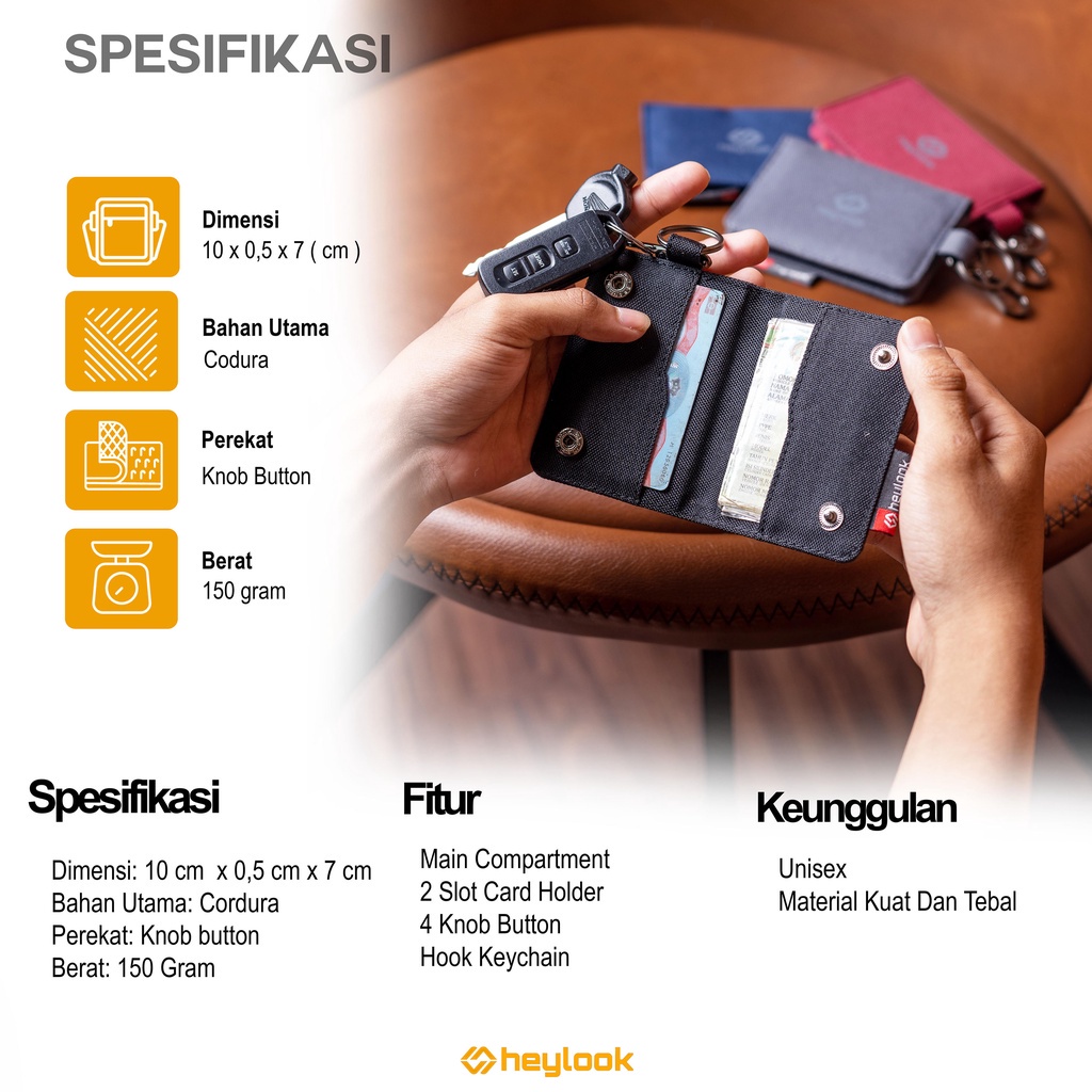 SPESIFIKASI: โ Material : Cordura โ Terdapat 2 tempat kartu di bagian Dalam โ Terdapat Hook Keychain dibagian atas untuk mengaitkan kunci โ Terdapat 4 knob buton untuk merekatkan sisi kiri dan kanan agar tidak jatuh