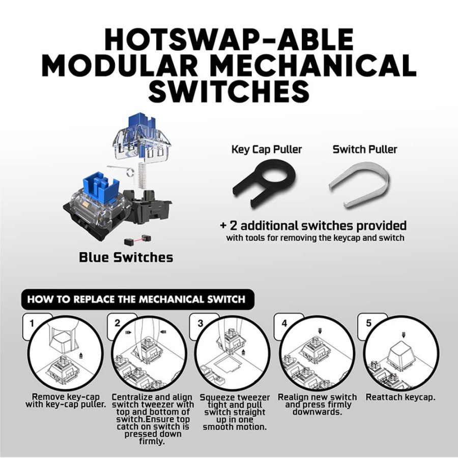 - Keycaps: 104 x KevlarTech High Quality Keycaps dengan garansi tahan pudar seumur hidup - Panjang Kabel: Kabel Berkualitas Tinggi 1,5M - Dimensi Keyboard : L 426 | W 120 | H 36 MM - Blue Swicth - Total Travel: 4.0 ± 0.5MM - Work Travel: 2.20 ± 0.6MM - Work Force: 60G ± 10G - Tactile/Pengoperasian : 60 ± 15GF - Tactile Travel: 1.8MM - Kekuatan Pemicu: Min 30GF, Max 65GF - Waktu Respons : < 5m sec @ 400 mm/s