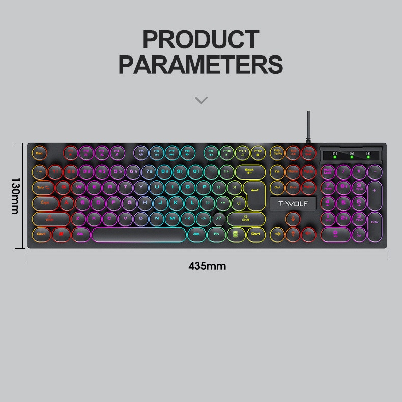 Parameter PAPAN KUNCI Nomor model Merek. T-serigala T80 Jenis Keycap: Keycap Punk Keycap Efek Pencahayaan Berwarna-warni: Cahaya berwarna-warni Tombol fungsional: Kombinasi tombol Multimedia Jumlah tombol keyboard: 104 tombol Panjang kabel Keyboard: 125cm Berat Keyboard: 414g Ukuran Keyboard: 435 × 130 × 25mm Antarmuka Keyboard: USB
