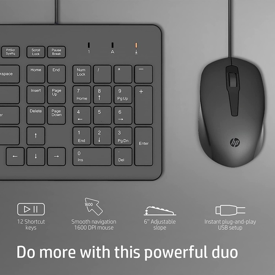 HP 150 Wired Keyboard and Mouse Combo with Instant USB Plug-and-Play Setup, 12 Shortcut Keys, 6° Adjustable Slope (Keyboard) and 1600 DPI Optical Sensor (Mouse) Maximize your productivity with this power-packed HP keyboard and mouse combo, perfect for professional use. Work with ease with a design that ergonomic, sleek and naturally comfortable. Experience ultra-responsive control with a 1600 DPI optical sensor (Mouse) Enjoy high performance with low noise – get high-speed, accurate typing with low-profile quiet keys (Keyboard)