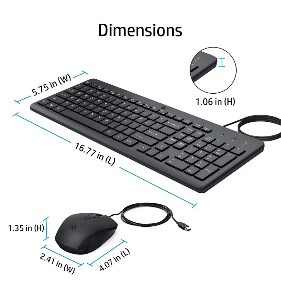 Keyboard & Mouse -Compatible with : PCs with available USB-A port. -Compatible Operating Systems : Windows 11; Windows 10 -Minimum dimensions (W x D x H) : 42.59 x 14.61 x 2.68 cm (keyboard) 10.34 x 6.11 x 3.42 cm (mouse) -Package dimensions (W x D x H) : 50.5 x 16.6 x 4 cm -Weight 0.44 kg (keyboard); 0.06 kg (mouse)