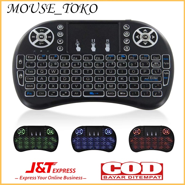 MINI KEYBOARD BACKLITE i8 FEATURES : Warna rgb dapat berubah jadi biru hijau dan merah 92 keys, 2.4GHz wireless Keyboard with Touchpad Touchpad DPI adjustable functions. Built-in high sensitive smart touchpad with 360-degree flip design. - Operating range: 15 meters(MAX), without signal disturbance and no direction limit. - Frequency range: 2.403GHZ ~ 2.480GHZ - Operational voltage: 3.3V - Charge Voltage: 4.4V ~ 5.25V - Modulation: GFSK - Channel: 78channels - TX Power: less than +5dBm - Transmission rate: 1M bit/sec - Frequency tolerance: +/-30ppm - Power consumption: 55mA(on), 1mA(sleep) - Color: White + Black - Battery Type: Built-in lithium-ion battery - Item size: 15 * 10 * 2cm - Item weight: 107g - Package size: 17 * 14.5 * 3.5cm - Package weight: 175g COMPATIBLE WITH : PC/IPAD/Andriod/TV Box/Google TV Box/for Xbox360/for PS3/HTPC/IPTV dan lain-lain --------------------------------------------------------------------------------------- SET KEYBOARD & MOUSE WIRELESS APPLE STYLE FERATURES : Jika ingin connect ke Ipad atau Handphone harus sambungkan kabel OTG dulu sebelum ke USB receiver - Type: 2.4G Wireless - Connectivity Technology: Wireless, USB - Effective distance: 10m - Voltage: 1.5V - Battery: AAA(unincluded) - Weight: 400g Kelengkapan: - 1x Mouse - 1x Receiver USB - 1x Keyboard Ukuran: - keyboard : 28,5cmx1,8cmx13,3cm - Mouse : 11,3cmx5,9cmx2cm COMPATIBLE WITH : Windows/Linux/Smart TV/Laptop/Raspberry PI 3 --------------------------------------------------------------------------------------- KEITTIO KEYBOARD WIRELESS LIPAT 3 FEATURES : - Warna: Hitam, Putih - Ukuran: 30.2 x 9.7 x 0.9 cm - Berat: 285 gr - Material: Aluminium Alloy + ABS Keyboard Bluetooth Nirkabel Ini memiliki bentuk yang modern dan minimalis. Dengan koneksi bluetooth anda dapat dengan mudah menggunakan keyboard tanpa terbatas jangkauan kabel. Memiliki desain keyboard yang modern slim dan tipis sehingga mudah dibawa bepergian dan digunakan kapanpun Anda butuhkan. Cocok digunakan untuk tablet dan smartphone. Anda dapat menyambungkan keyboard ini dengan laptop, pc, smartphone bahkan table --------------------------------------------------------------------------------------- SET MULTIMEDIA KEYBOARD FEATUREA : - Pan Nordic keyboard layout Mini USB dongle Up to 10 m range - Operation: 10x function/media keys Power LED/Caps LED/Num LED - Signal: 2.4GHZ wireless radio - Power: 2x AAA battery(not included) Auto wake/sleep Auto power off after 10min - Material: Scissor switch key switches Plastic keyboard ABS plastic - Connections. USB Type A dongle - Compatibility: Plug and play MOUSE FEATURES : - Optical sensor Mini USB dongle Up to 10 m range - Operation: 3 buttons, left right,wheel, DPI select button Scroll wheel - Compatibility: Plug and play - Signal: 2.4GHZ wireless radio 20-2000 Hz polling rate 1000/1200 dip - Power: 2x AAA battery (not included) Auto wake /sleep, Auto power off after 10 min - Connections: Usb Dongle