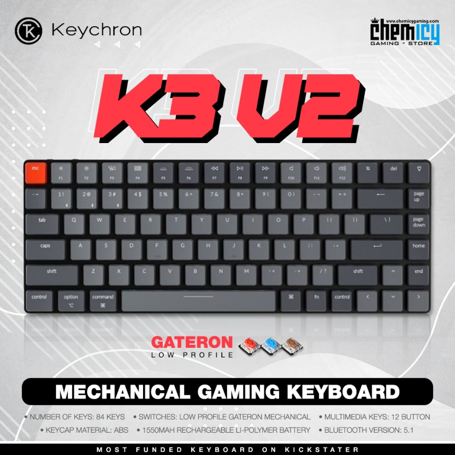 📛 Spesifikasi : ❇️ Dimension: 306 x 116mm ❇️ Number of Keys: 84 keys ❇️ Layout: ANSI ❇️ Version: Gateron / Optical / Hot-swappable ❇️ Switches: Low profile Gateron mechanical / Low profile Keychron Optical ❇️ Number of Multimedia Keys: 12 ❇️ Frame Material: ABS+Aluminum frame ❇️ Keycap Material: ABS ❇️ Battery: 1550mAh Rechargeable li-polymer battery ❇️ Bluetooth version: 5.1