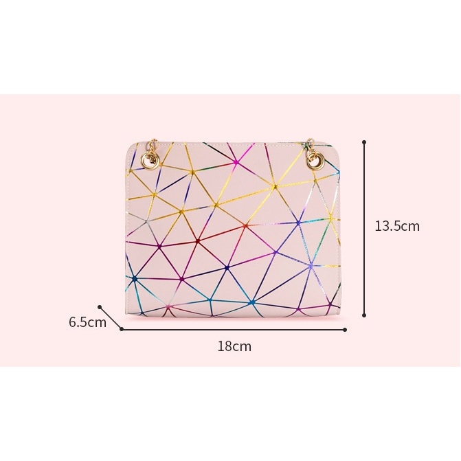 tas elegant dengan motif garis 3D yang mengkilat dan mewah Ukuran : 18 x 6,5 x 13,5 cm Kompartemen : 1 Ruang Penyimpanan Besar Strap : 1 Tali rantai emas stok terbatas