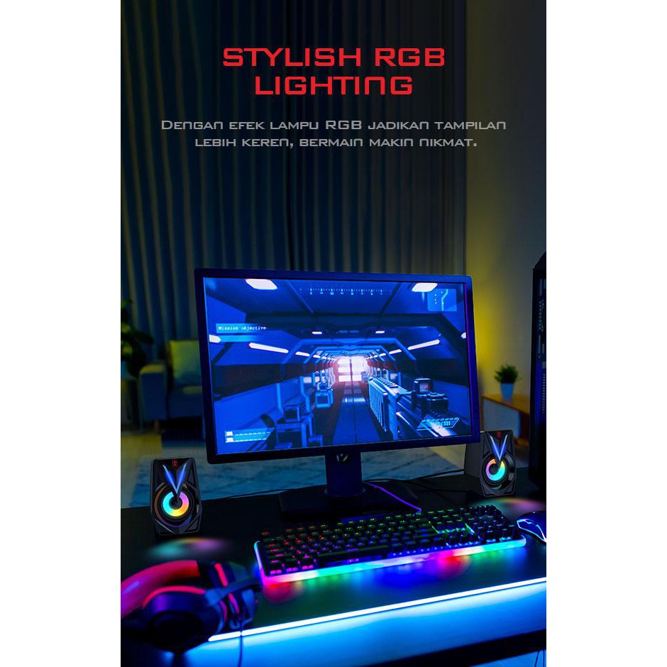 Keunggulan: 1. Stylish RBG Lightning, dengan efek lampu RGB jadikan tampilan lebih keren, bermain dengan nikmat 2. Surround sound, memberikan immersive surround sound experience, pergerakan musuh dapat terdengar dengan jernih 3. Game style design, menjadi lebih semangat bermain game 4. 6W powerful speaker, dengan pergerakan 2.5 inchi, konfigurasi suara profesional, bass lebih kuat 5. Double port input, USB plug dan 3.5mm audio jack