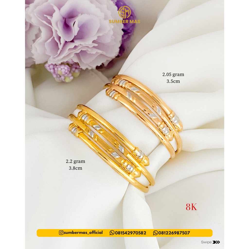 Nama Barang : KIDS SERIES BANGLE Berat : 2.05gr - 2.2gr Ukuran : 3.5 & 3.8 Variasi : Gold Kadar Emas : 8k (375)