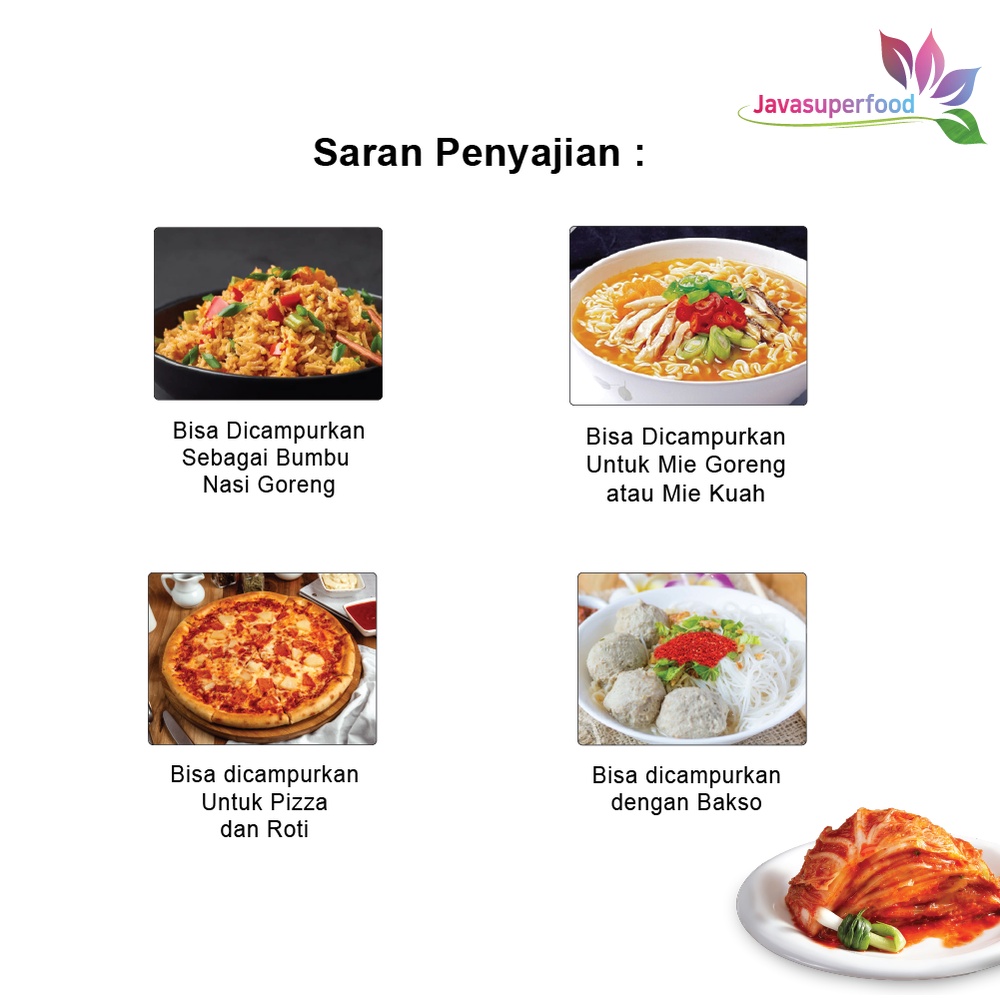Komposisi : Maltodekstrine, Gula, Cabe Bubuk (13,8%), Perisa alami Kimchi (13.6%), Penguat rasa mononatrium L-Glutamat, Bawang Putih Bubuk (7%), Bawang Bombay Bubuk (6%), Ikan Teri Bubuk, Udang Bubuk, Pengatur keasaman asam sitrat, Jahe Bubuk. Mengandung pengawet sulfit. Mengandung alergen, lihat daftar yang dicetak tebal.