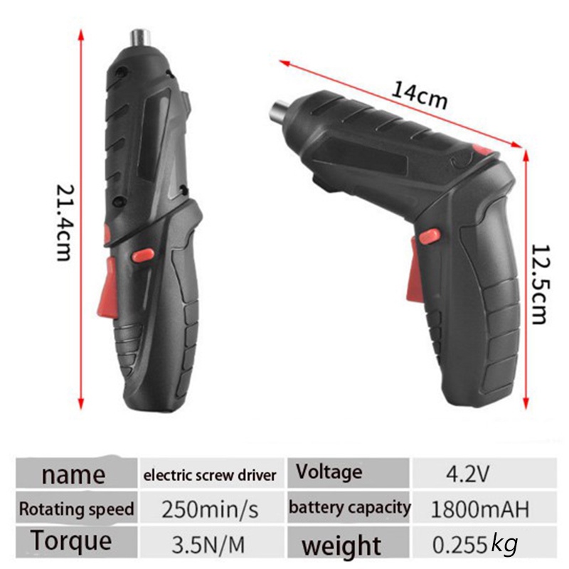-Daya listrik: 4.2v -Baterai isi ulang 1500mAh -Torsi maksimum 3.5Nm -Kecepatan perputaran: 250rpm -Waktu penggunaan: 3-5 jam -Panjang keseluruhan: 21.4 (mm) -Diameter sekrup maksimum: 4 mm -Dengan mata obeng dan mata kunci, total 49 buah -Kapasitas pengeboran: kayu/aluminium/besi/ubin -Metode penjepitan bor: bor chuck -Kecepatan perputaran: 1150 (rpm) -2 sistem: sekrup pengeboran/pengencangan -Struktur: struktur bor pistol -Jenis Daya: Teknologi Baterai Lithium Isi Ulang