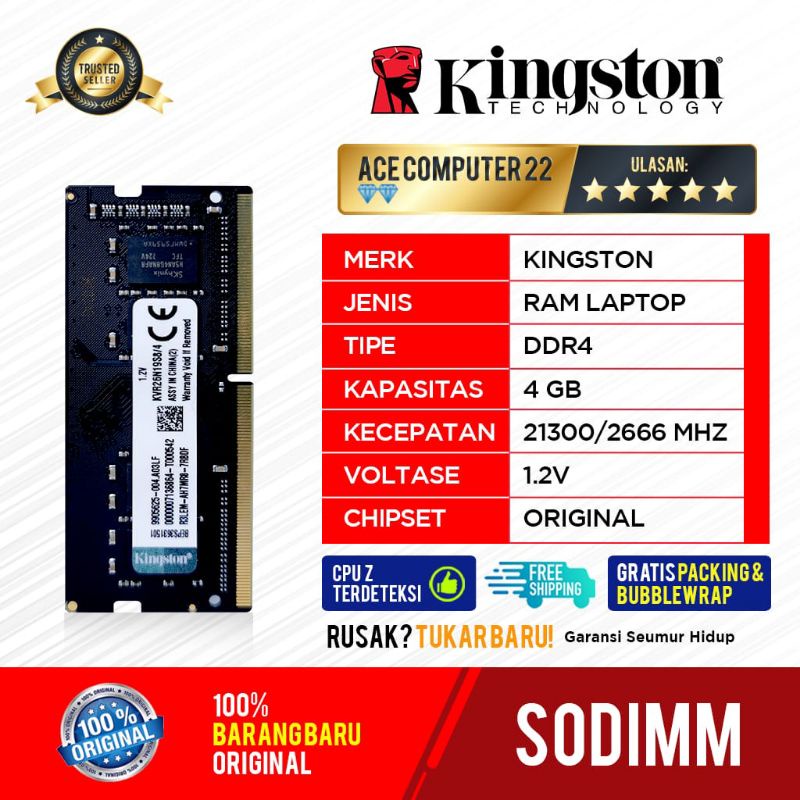 Deskripsi produk : * Barang 100% Baru * Pemakaian untuk SODIMM / LAPTOP * Kapasitas 4GB * Speed PC 21300 / 2666MHz * Kompatible ( Cocok ) dengan semua motherboard yang menggunakan DDR4 / PC4 * Premium Quality * Voltage : 1.2V * ECC : No