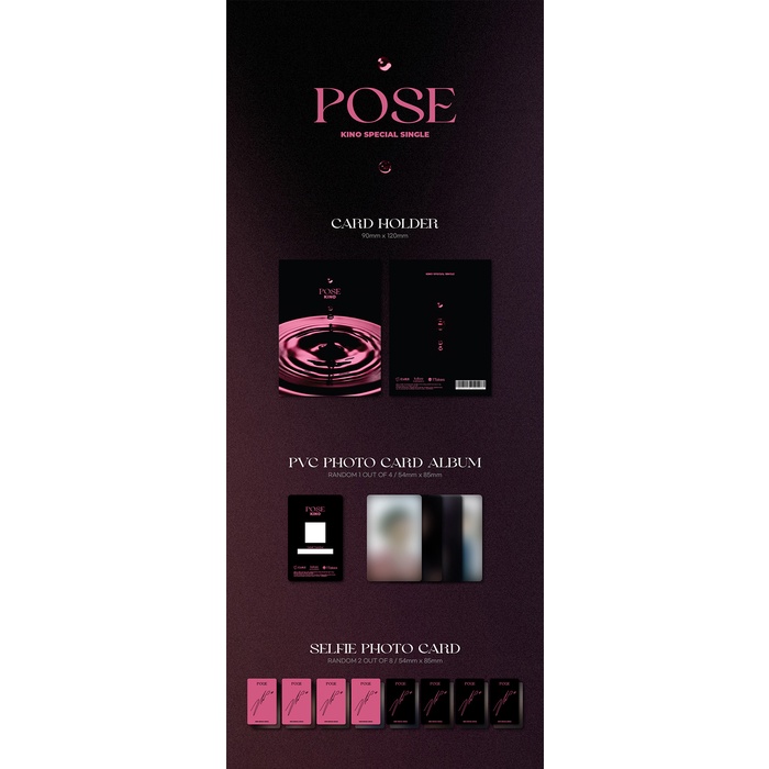 COMPONENTS โ ๐ฝ KINO - SPECIAL SINGLE ALBUM [POSE] PLATFORM VER. ใใ๐ CARD HOLDER: 90*120mm ใใ๐ PVC PHOTOCARD ALBUM: 54*85mm | RANDOM 1 of 4 ใใ๐ SELFIE PHOTOCARD: 54*85mm | RANDOM 2 of 8 ใใ๐ POSTCARD: 110*80mm | RANDOM 1 of 4